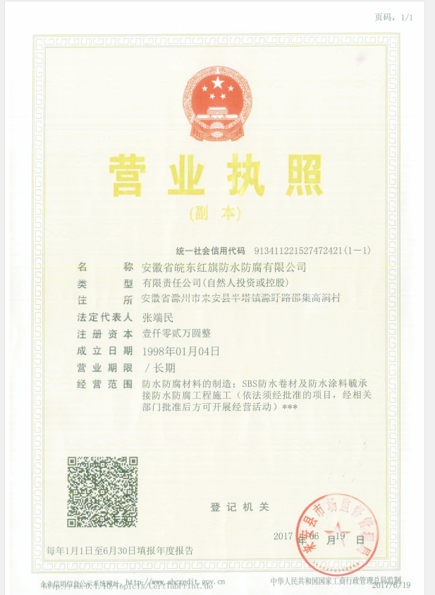 - 安徽省皖東紅旗防水防腐有限公司,位于形兼吳楚,氣越淮揚(yáng),儒風(fēng)之盛,夙貫淮東之譽(yù)的滁州市來(lái)安縣半塔鎮(zhèn)滁盱路工業(yè)區(qū)。公司于1998年1月在滁州工商局注冊(cè)成立,20年來(lái)一如既往的致力于防水行業(yè)的科研、生產(chǎn),是一家專(zhuān)業(yè)防水生產(chǎn)廠(chǎng)家?,F(xiàn)公司旗下瑞民、...